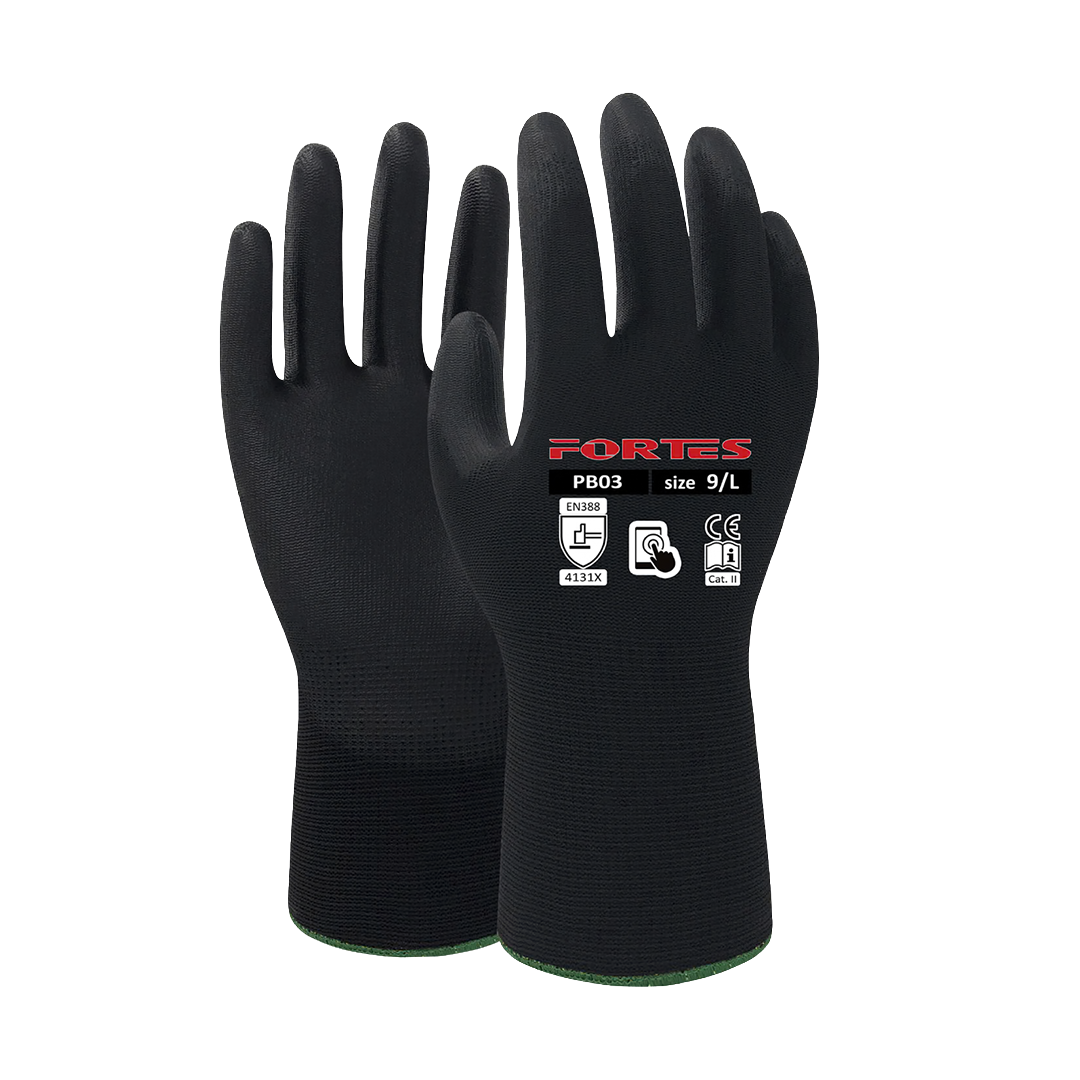 Arbeidshanske Fortes PB03 Str9. Smidig og luftig arbeidshanske. PU-belegget gir høy slitestyrke og godt grep. Sømløst strikket for en fleksibel og behagelig følelse. Den pustende overdelen holder hendene kjølige gjennom arbeidsdagen. Egnet for lager-, monterings- og presisjonsarbeid.LuftigSertifisert i samsvar med EN 388 4131X.